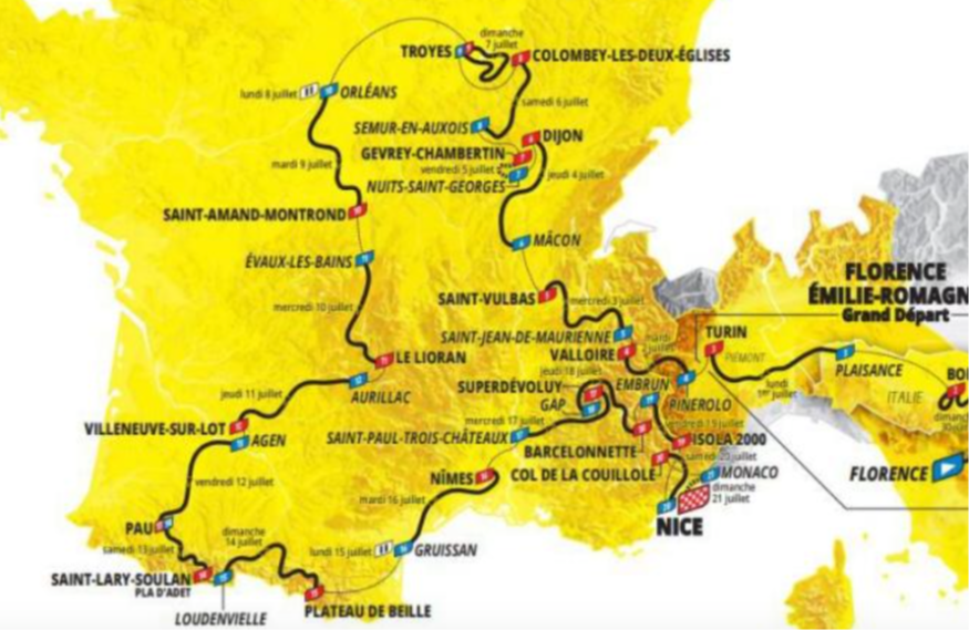 Le 111e Tour de France se lancera depuis l'Italie et Florence le 29 juin prochain, pour quatre étapes de l'autre côté des Alpes. Après une remontée par la Bourgogne et une descente via le Massif Central, les cyclistes débarqueront dans le Lot-et-Garonne le 11 juillet (12ème étape), avec une arrivée à Villeneuve-sur-Lot – la première depuis 2 000 –, au terme d'une étape de 204 kilomètres au départ d'Aurillac. Comme de coutume le Tour prendra ensuite la direction de Pau, pour une 13ème étape qui fera la part belle au Lot-et-Garonne avec Agen comme ville-départ, et au Gers – comme confirmé par le président du département Philippe Dupouy – de Cazaubon à Riscle, en passant par Salles-d'Armagnac, Urgosse et, comme cette année, Nogaro. Place ensuite à un enchainement pyrénéen les 13 et 14 juillet. La 14ème étape, longue de 152km, reliera Pau à Saint-Lary-Soulan/Pla d'Adet, en passant par le Tourmalet et la Hourquette d'Ancizan, avant un feu d'artifice lors de la 15ème étape, jour de fête nationale, entre Loudenvielle et le Plateau de Beille.