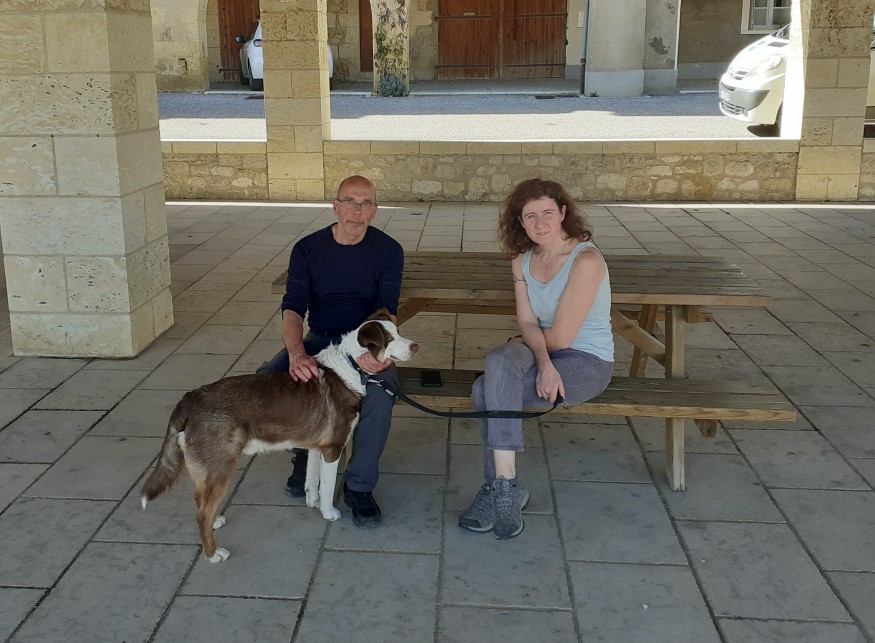 Photo : Michel Berry, Caroline Durand et le chien Scotty, sous la halle de Barran