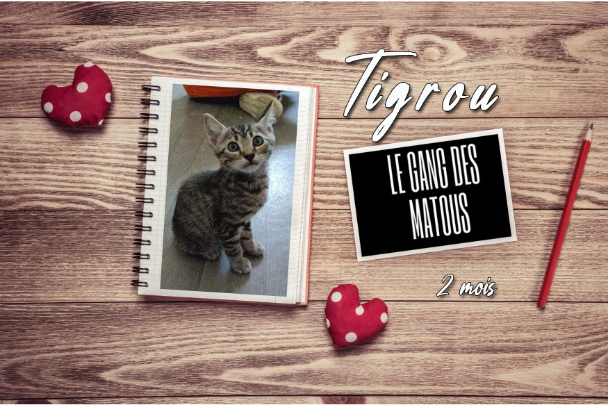 Tigrou est un petit mâle tabby brun de 2 mois environ. Un petit bonhomme énergique comme tout chaton de son âge. Il est très câlin et champion d'escalade, il adore vous prendre pour un arbre à chat. En somme, il est plein de vie et assez gourmand. Un compagnon plus âgé deja présent serait un plus.Visible chez Carine à Pavie et à adopter sous contrat associatif.• Les frais d'adoption correspondent au remboursement des frais vétérinaires : identification, primo vaccination et anti parasite interne /externe. La stérilisation est également comprise.• Les frais d'adoption sont de 130......
