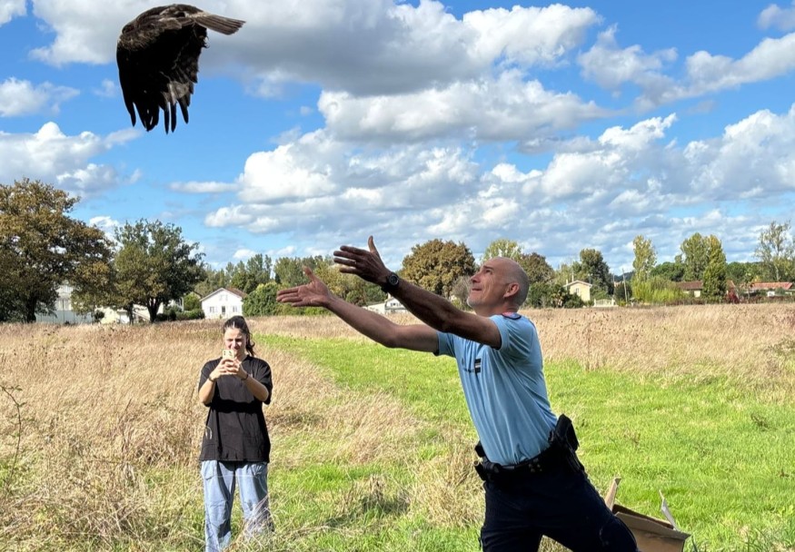 C'est une intervention peu habituelle qui avait été réalisée par les gendarmes de la Brigade de Riscle l'été dernier. Ils avaient recueilli au sein de la brigade un aigle blessé avec une aile abimé. L'animal apeuré avait été confié au centre de soins de la faune sauvage "Paloume" basé à Pouydesseaux dans les Landes pour y être soigné. Après plusieurs semaines de soins, le rapace remis sur pattes par les membres de l'association, est revenu en début de semaine dans le Gers pour un nouvel envol. Une jolie histoire qui s'est soldée par une belle image, c'est le commandant de communauté de la brigade qui l'a relâché dans son environnement.