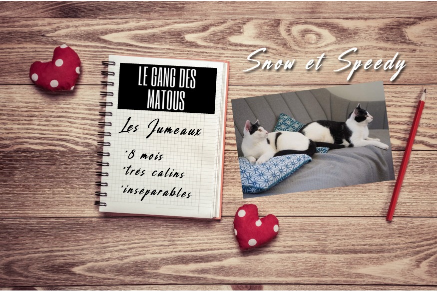 Ce sont deux frères nés en mai qui font la une de la rubrique aujourd'hui. Jusqu'à maintenant, le Gang des Matous a essayé de les faire adopter séparément mais ils n'ont jamais eu une demande d'adoption pour l'un ou l'autre. Depuis tout ce temps passé ensemble, ils sont désormais inséparables. Snow est très câlin, il saura vous réclamer son lot de caresses chaque fois que l'occasion se présentera et ne passera pas à côté de quelques friandises. Joueur, il a une attirance particulière pour les petites balles, les crayons et contrairement aux idées reçues,......