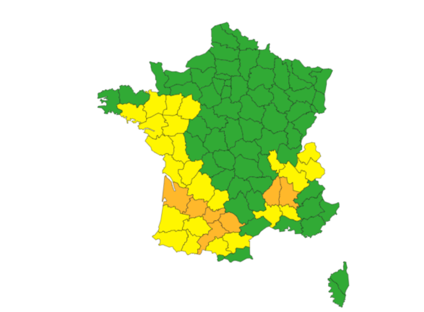 7 départements en orange dont 5 en Sud Ouest