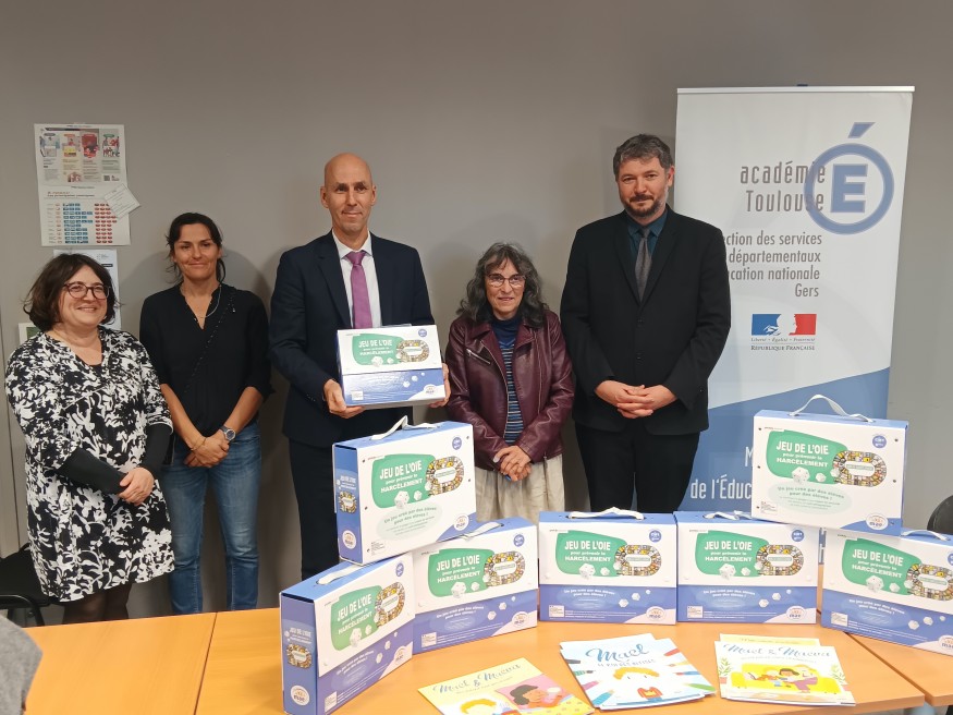 Dans le cadre du programme pHARe (lutte contre le harcèlement à l'école), la MAE du Gers, producteur du jeu de l'oie « non au harcèlement » a fait don à la direction académique du Gers de huit exemplaires de l'outil pédagogique pour cycle 3 (CM2-5ème).