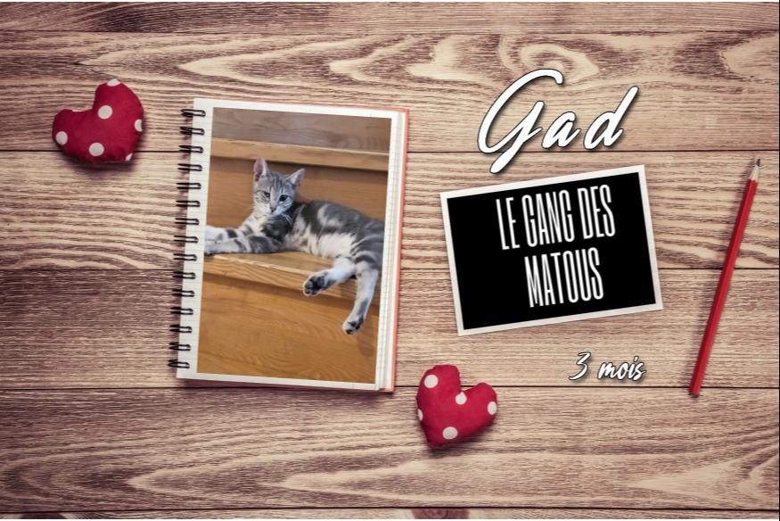 Gad est un mâle silver tabby d'environ 3 mois avec un début de vie difficile pour ce petit bonhomme sorti de la rue avec sa soeur. Aujourd'hui victime de l'errance, il a dû subir une opération dont il ne gardera aucune séquelle. Atteint de symblépharon dûe à un herpès. Sorti d affaire, il cherche sa famille pour la vie.